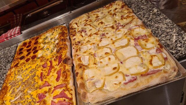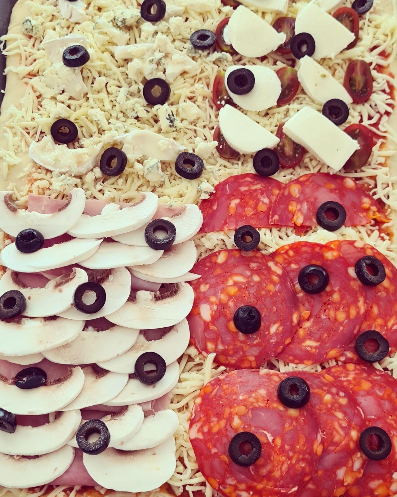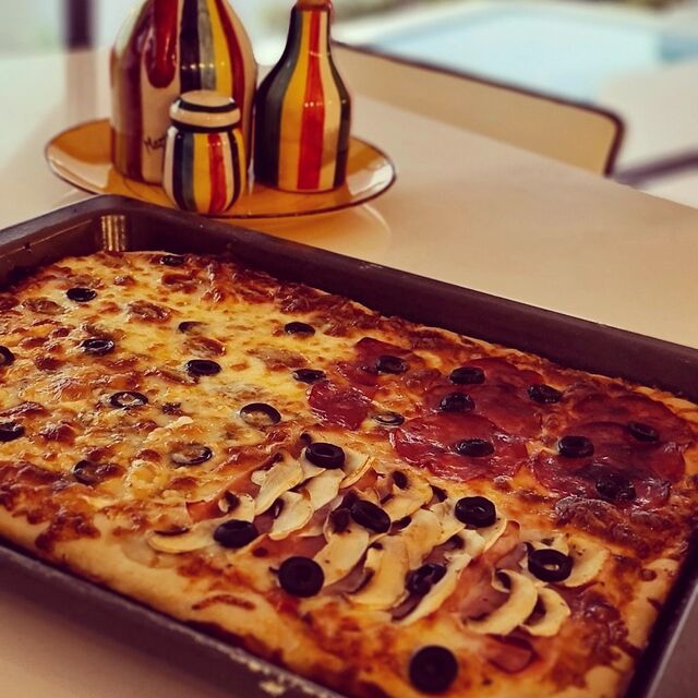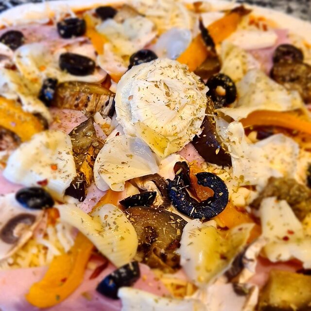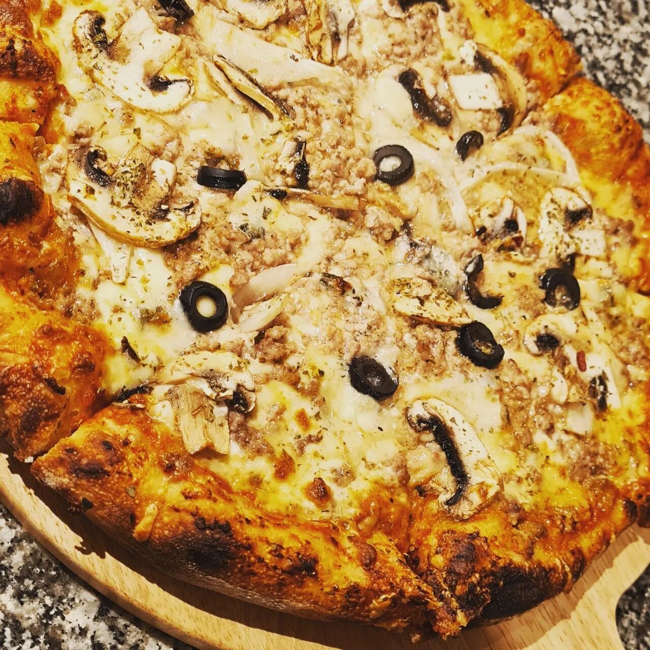 Base crème, emmental, mozza, thon, oignons, parmesan, persil, olives
